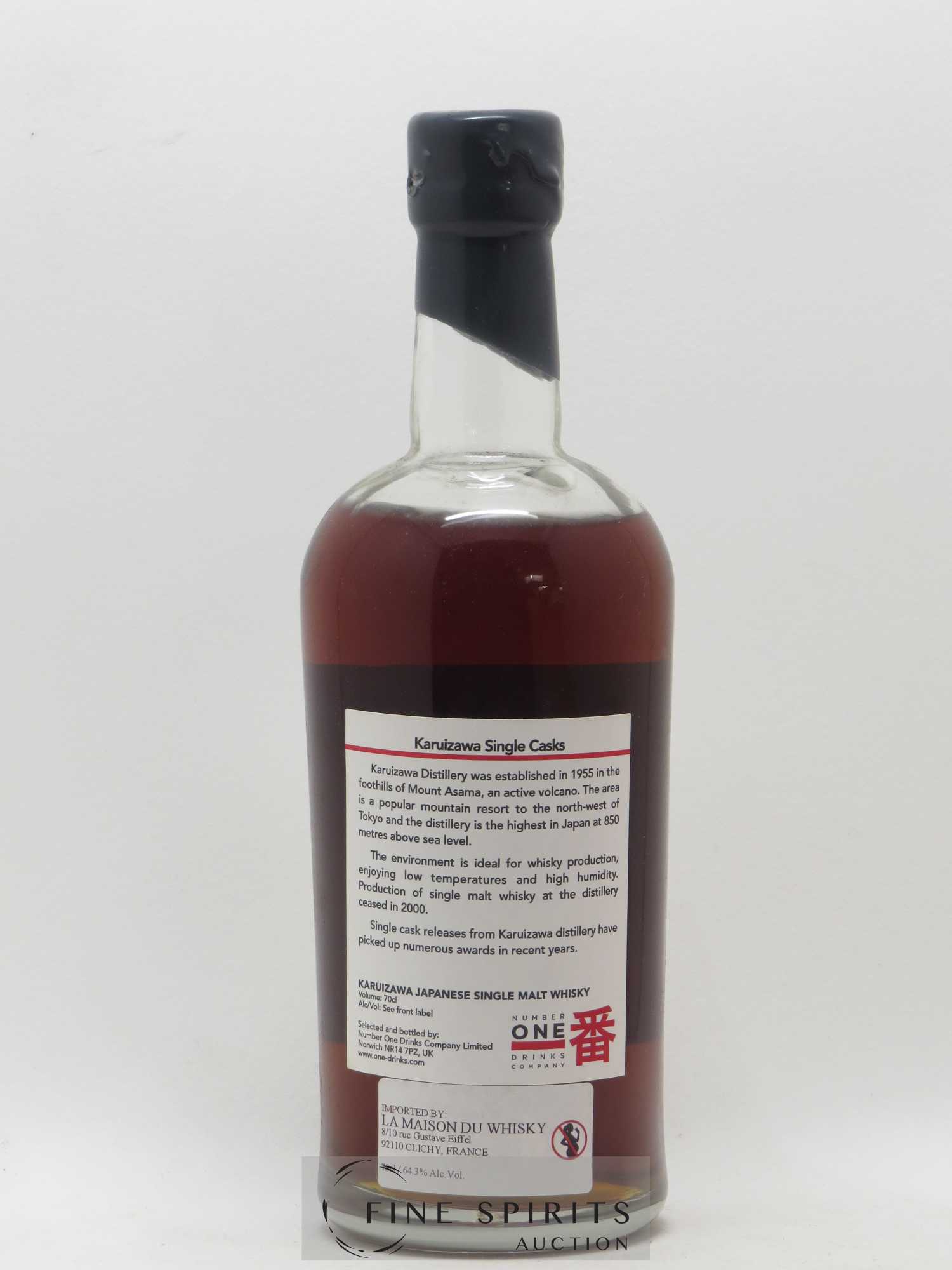 Mise en sommeil au début de l'année 2000, Karuizawa ferme définitivement ses portes au printemps 2012. Située aux pieds de l'un des volcans les plus actifs du Japon, Mont Asama, Karuizawa commence à distiller son malt dès 1956. Dotée de petits alambics chauffés directement et alimentés au charbon, Karuizawa produit un malt robuste et corpulent qui s'accommode parfaitement d'un élevage long en ex-fûts de sherry en provenance d'Espagne (premiers remplissages) ou de distilleries écossaises (dont Mortlach, pour les seconds remplissages). Karuizawa est un malt distillé pour réaliser les blends « Ocean » du groupe Daikoku. Les embouteillages de type single malts sont alors réservés pour le visitor center de la distillerie ou quelques clients privés. Ces mises en bouteilles à la main étaient proposées en versions single casks millésimés, bruts de fûts. Seul ce qui était nécessaire à l'embouteillage était prélevé du fût, le reste étant laissé à vieillir dans la barrique. Cette pratique explique qu'une même barrique puisse exister sous différents embouteillages d'âges et de versions différentes. Ainsi, le fût #6177, millésimé 1970, existe sous deux étiquettes : l'une de 31 ans, Distillery Edition (2002) et l'autre de 42 ans, Vintage Single Cask Edition (2012). C'est sous l'égide de la société Number One Drinks qui, en 2006, rachète les quelques 300 barriques encore disponibles à la distillerie, que Karuizawa entre dans la légende.
