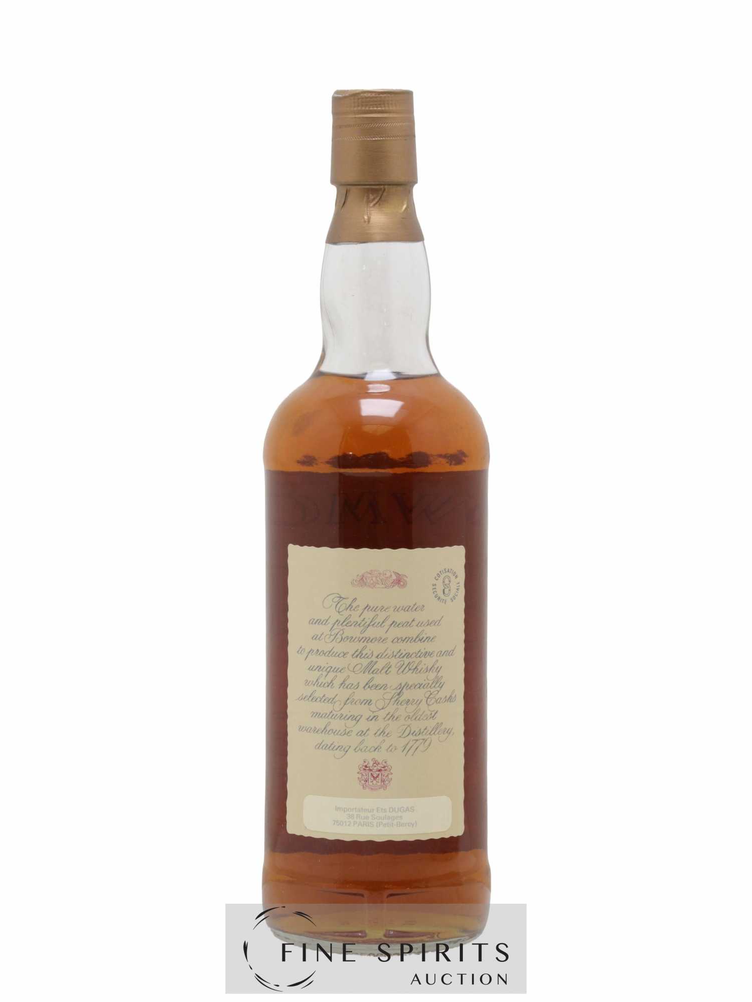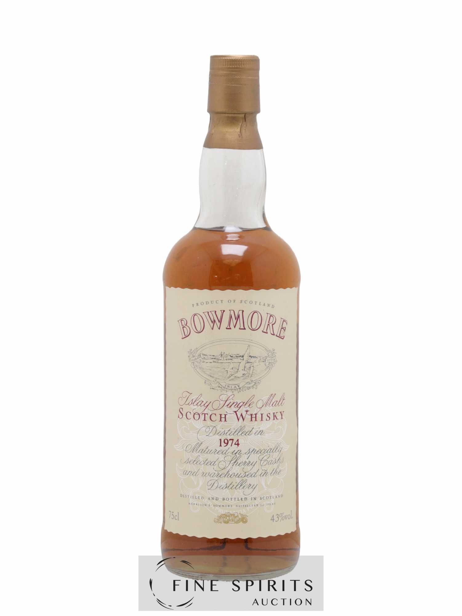 Bowmore distillé en 1974 et embouteillé dans les années 1980. On trouve plusieurs millésimes avec cette étiquette, de 1956 à 1974. La plupart de ces Bowmore sont embouteillés réduits, comme ce 1974, mais certains ont été embouteillés bruts de fût. D'autres éditions leur succèdent dans les années 1990, cette fois avec une mention d'âge et plus seulement le millésime. Distillées dans ce que beaucoup considèrent comme une des plus belles périodes de Bowmore (les années 1950 à 1970), ces éditions sont très recherchées.