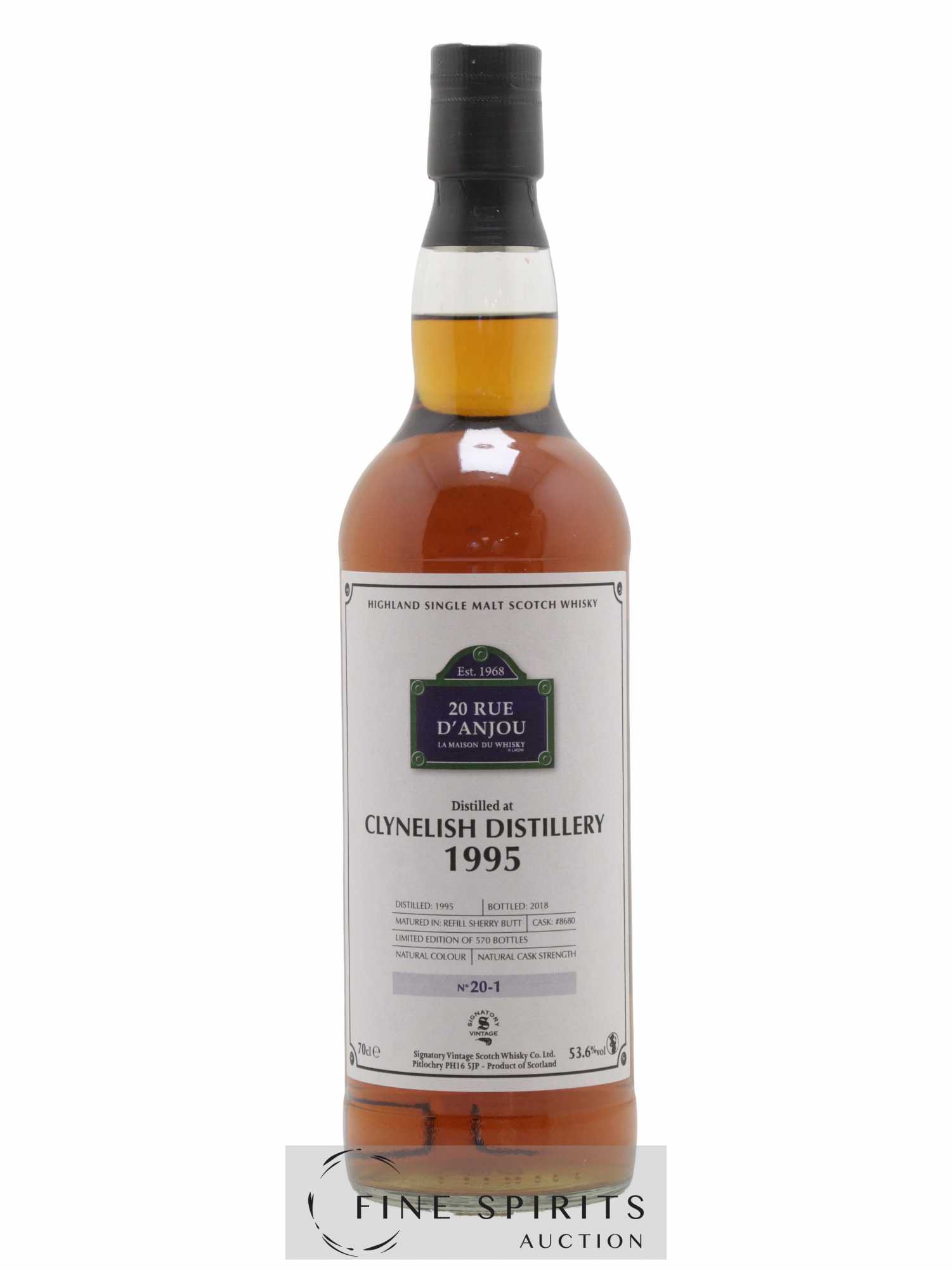 Single cask (#8680) de Clynelish 1995 embouteillé en 2018 par Signatory Vintage. Signatory Vintage a été fondé en 1988 par Andrew Symington qui a commencé son activité au Prestonfield House d'Édimbourg où il sélectionne des fûts spécialement pour l'hôtel. En 2002, il fait l'acquisition de la distillerie Edradour, à Pitlochry dans les Highlands. Il y relocalise aussi Signatory Vintage dont les chais font face à la distillerie. Edition limitée à 570 bouteilles dans la gamme 20 rue d'Anjou, adresse de la première boutique de La Maison du Whisky, un importateur et distributeur de whisky et de spiritueux fondé en 1956 par Georges Bénitah.