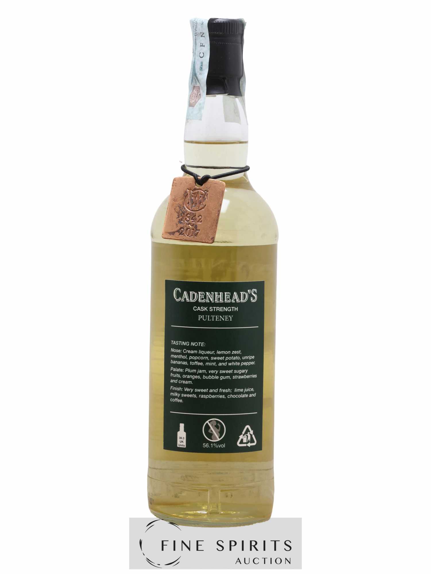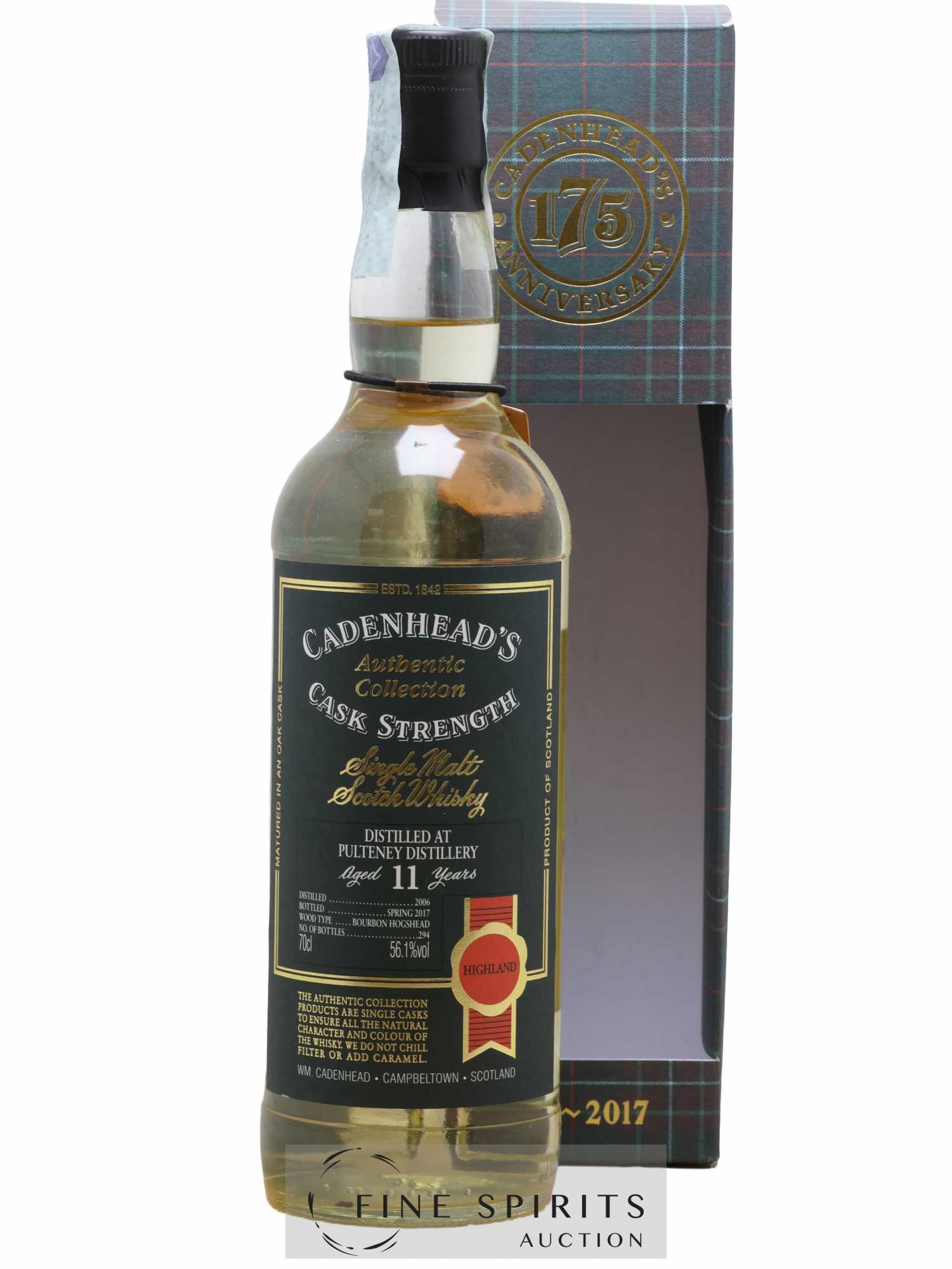 Single cask de Pulteney distillé en 2006, vieilli en fût de bourbon et embouteillé en 2017 dans la gamme Authentic Collection. Cadenhead's est fondée en 1842 par Georges Duncan à Aberdeen. William Cadenhead rejoint l’’entreprise puis, à la mort de Georges Duncan, en prend les rênes et la rebaptise à son nom, William Cadenhead Ltd. Le neveu de William, Robert Duthie, développe l’’entreprise au début de 20ème siècle et cette dernière reste une entreprise familiale jusqu’’en 1969. William Cadenhead Ltd est ensuite vendue à J. & A. Mitchell and Co., propriétaire de la distillerie Springbank. Hedley G. Wright , descendant direct d’’Archibald et John Mitchell, devient ainsi président de William Cadenhead Ltd. Par le passé, Cadenhead vendait plutôt ses propres marques comme Putachieside, The Hielanman, Seven Stars ou les rhums « Green Label ». Avec Hedley G. Wright à sa tête, Cadenhead commence à s’’intéresser de plus en plus aux single malts. Ainsi, c’’est en 1977 qu’’est créée la mythique collection des « dumpy bottles ». Cette série de single malts avait la particularité d’’être embouteillée avec une légère filtration, sans colorant artificiel et un degré d’’embouteillage assez élevé pour l’’époque (80 proof, 45,7%). L’’étiquette affichait de multiples détails tel que le mois et l’’année de distillation et d’’embouteillage ainsi que l’’utilisation ou non de fût de sherry. Toujours en 1977, l’’entreprise s’’installe à une autre adresse à Aberdeen puis déménage finalement à Campbeltown. Cadenhead vend également des fûts à des embouteilleurs mythiques comme Samaroli ou Corti Brothers dans les années 1980 via une filiale, Duthie’’s. Enfin, deux nouvelles gammes furent créées en 1991 et 1992, « Original Collection » à 46% et « Authentic Collection » au degré naturel. D’’autres séries spéciales pour fêter les anniversaires emblématiques de Cadenhead (150 ans et 175 ans) ainsi que de nouvelles gammes (Small Batch, World Whiskies…) verront le jour jusqu’’à aujourd’’hui. Édition limitée à 294 bouteilles.