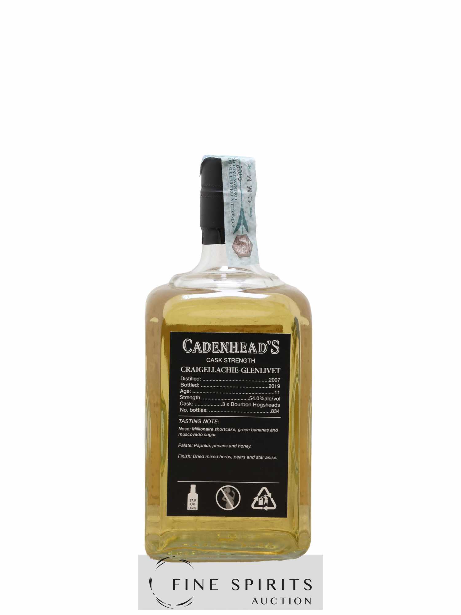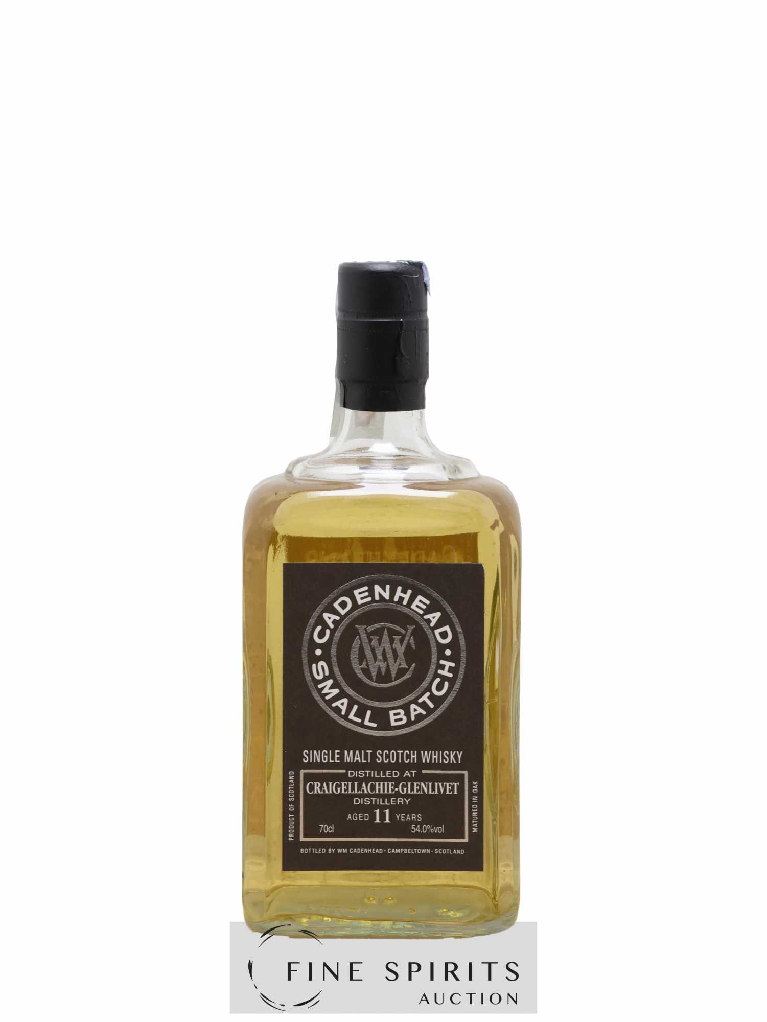 Small batch de Craigellachie distillé en 2007 et embouteillé en 2019. Cadenhead's est fondée en 1842 par Georges Duncan à Aberdeen. William Cadenhead rejoint l’’entreprise puis, à la mort de Georges Duncan, en prend les rênes et la rebaptise à son nom, William Cadenhead Ltd. Le neveu de William, Robert Duthie, développe l’’entreprise au début de 20ème siècle et cette dernière reste une entreprise familiale jusqu’’en 1969. William Cadenhead Ltd est ensuite vendue à J. & A. Mitchell and Co., propriétaire de la distillerie Springbank. Hedley G. Wright , descendant direct d’’Archibald et John Mitchell, devient ainsi président de William Cadenhead Ltd. Par le passé, Cadenhead vendait plutôt ses propres marques comme Putachieside, The Hielanman, Seven Stars ou les rhums « Green Label ». Avec Hedley G. Wright à sa tête, Cadenhead commence à s’’intéresser de plus en plus aux single malts. Ainsi, c’’est en 1977 qu’’est créée la mythique collection des « dumpy bottles ». Cette série de single malts avait la particularité d’’être embouteillée avec une légère filtration, sans colorant artificiel et un degré d’’embouteillage assez élevé pour l’’époque (80 proof, 45,7%). L’’étiquette affichait de multiples détails tel que le mois et l’’année de distillation et d’’embouteillage ainsi que l’’utilisation ou non de fût de sherry. Toujours en 1977, l’’entreprise s’’installe à une autre adresse à Aberdeen puis déménage finalement à Campbeltown. Cadenhead vend également des fûts à des embouteilleurs mythiques comme Samaroli ou Corti Brothers dans les années 1980 via une filiale, Duthie’’s. Enfin, deux nouvelles gammes furent créées en 1991 et 1992, « Original Collection » à 46% et « Authentic Collection » au degré naturel. D’’autres séries spéciales pour fêter les anniversaires emblématiques de Cadenhead (150 ans et 175 ans) ainsi que de nouvelles gammes (Small Batch, World Whiskies…) verront le jour jusqu’’à aujourd’’hui. Édition limitée à 834 bouteilles.