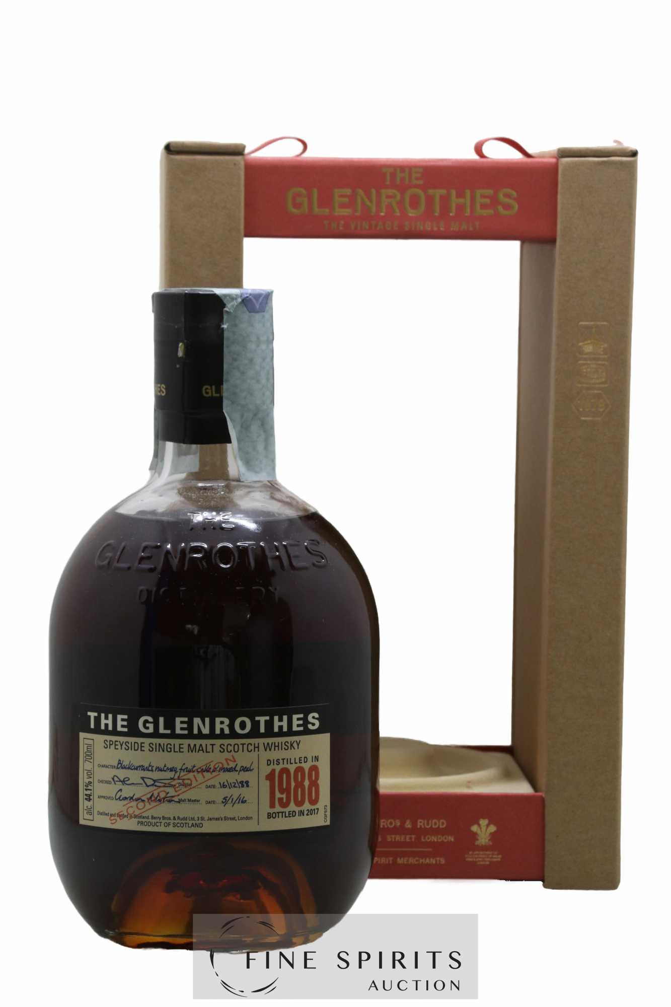 Glenrothes 1988 Second Edition est un single malt écossais du Speyside. Distillé en 1988, il a vieilli pendant 27 ans en fûts de sherry, dont des hogsheads de chêne américain de premier remplissage et des fûts de sherry butts de second remplissage. Embouteillé en 2017 à 44,1 % vol, cette édition est limitée à 700 bouteilles.