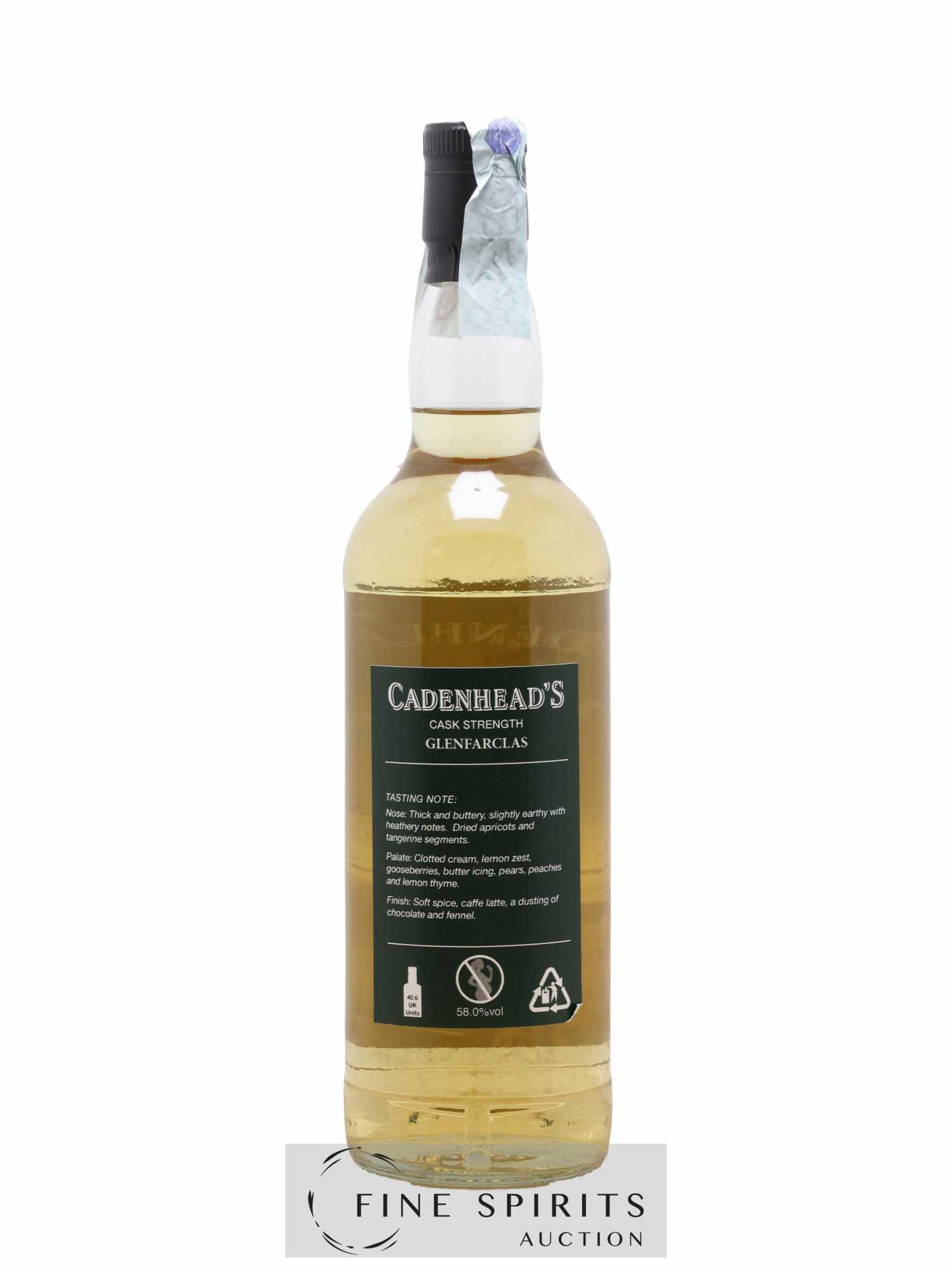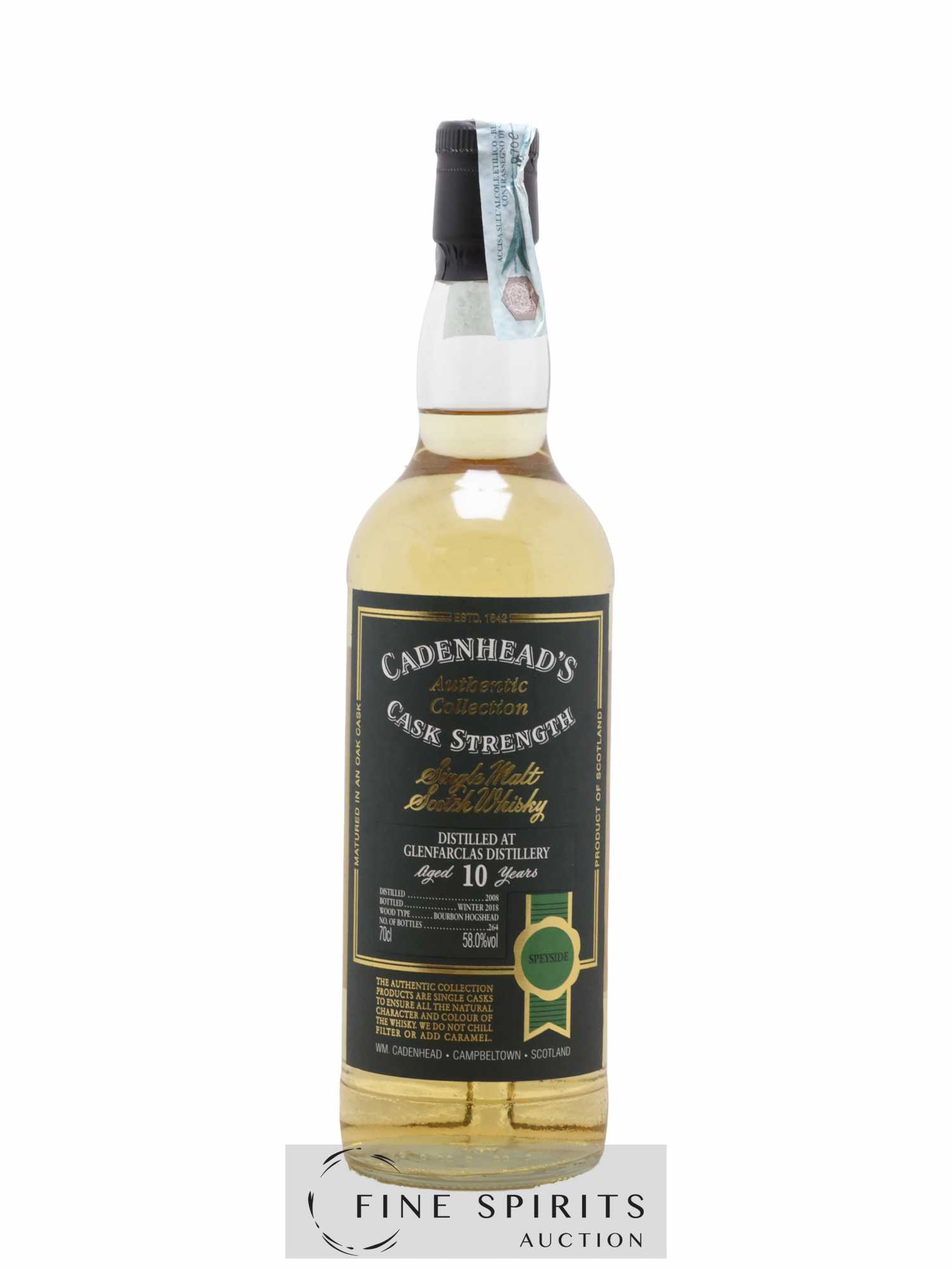 Single cask de Glenfarclas distillé en 2008, vieilli en fût de bourbon et embouteillé en 2018 dans la gamme Authentic Collection. Cadenhead's est fondée en 1842 par Georges Duncan à Aberdeen. William Cadenhead rejoint l’’entreprise puis, à la mort de Georges Duncan, en prend les rênes et la rebaptise à son nom, William Cadenhead Ltd. Le neveu de William, Robert Duthie, développe l’’entreprise au début de 20ème siècle et cette dernière reste une entreprise familiale jusqu’’en 1969. William Cadenhead Ltd est ensuite vendue à J. & A. Mitchell and Co., propriétaire de la distillerie Springbank. Hedley G. Wright , descendant direct d’’Archibald et John Mitchell, devient ainsi président de William Cadenhead Ltd. Par le passé, Cadenhead vendait plutôt ses propres marques comme Putachieside, The Hielanman, Seven Stars ou les rhums « Green Label ». Avec Hedley G. Wright à sa tête, Cadenhead commence à s’’intéresser de plus en plus aux single malts. Ainsi, c’’est en 1977 qu’’est créée la mythique collection des « dumpy bottles ». Cette série de single malts avait la particularité d’’être embouteillée avec une légère filtration, sans colorant artificiel et un degré d’’embouteillage assez élevé pour l’’époque (80 proof, 45,7%). L’’étiquette affichait de multiples détails tel que le mois et l’’année de distillation et d’’embouteillage ainsi que l’’utilisation ou non de fût de sherry. Toujours en 1977, l’’entreprise s’’installe à une autre adresse à Aberdeen puis déménage finalement à Campbeltown. Cadenhead vend également des fûts à des embouteilleurs mythiques comme Samaroli ou Corti Brothers dans les années 1980 via une filiale, Duthie’’s. Enfin, deux nouvelles gammes furent créées en 1991 et 1992, « Original Collection » à 46% et « Authentic Collection » au degré naturel. D’’autres séries spéciales pour fêter les anniversaires emblématiques de Cadenhead (150 ans et 175 ans) ainsi que de nouvelles gammes (Small Batch, World Whiskies…) verront le jour jusqu’’à aujourd’’hui. Édition limitée à 264 bouteilles.
