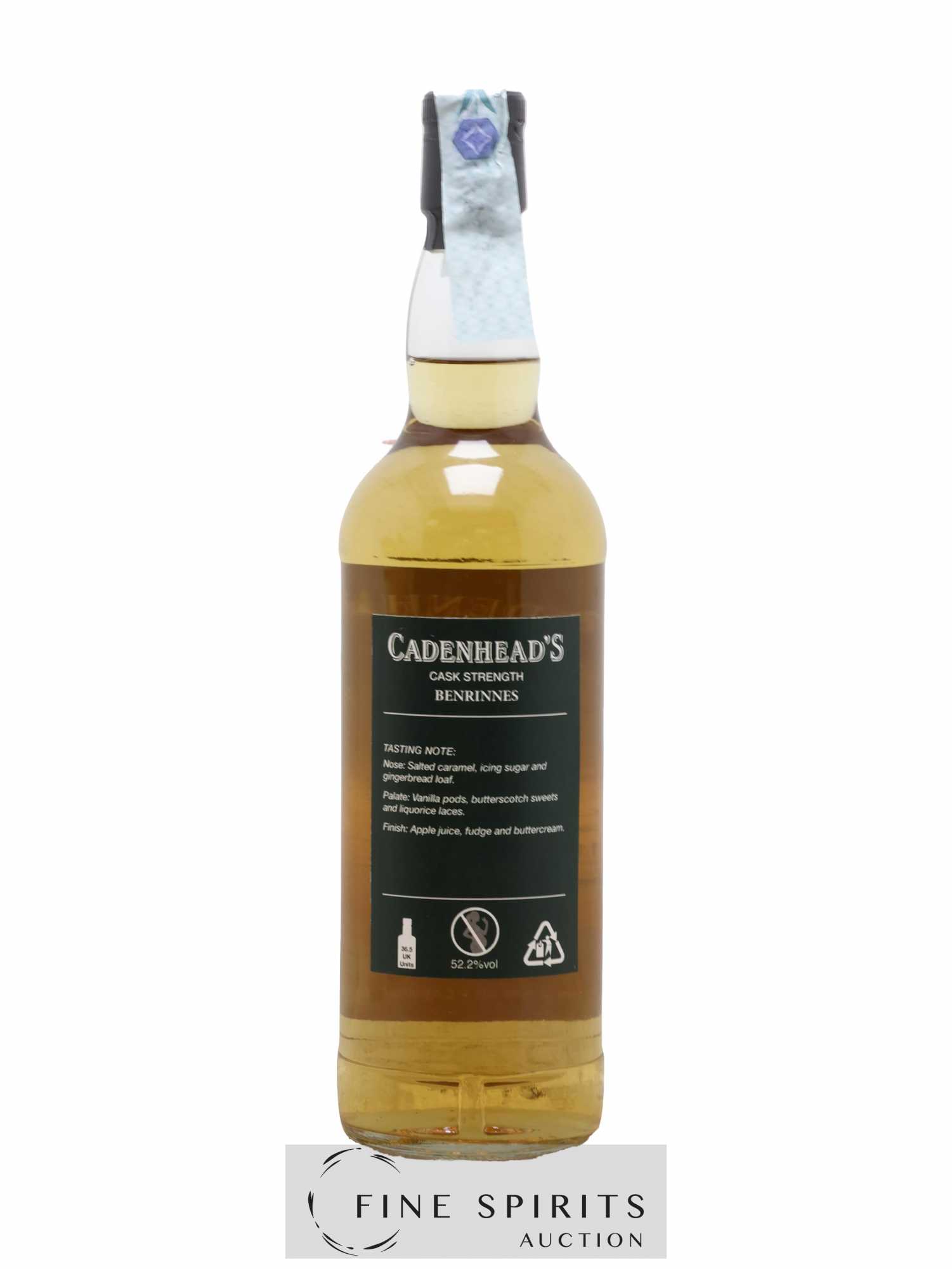 Single cask de Benrinnes distillé en 2004, vieilli en fût de bourbon et embouteillé en 2018 dans la gamme Authentic Collection. Cadenhead's est fondée en 1842 par Georges Duncan à Aberdeen. William Cadenhead rejoint l’’entreprise puis, à la mort de Georges Duncan, en prend les rênes et la rebaptise à son nom, William Cadenhead Ltd. Le neveu de William, Robert Duthie, développe l’’entreprise au début de 20ème siècle et cette dernière reste une entreprise familiale jusqu’’en 1969. William Cadenhead Ltd est ensuite vendue à J. & A. Mitchell and Co., propriétaire de la distillerie Springbank. Hedley G. Wright , descendant direct d’’Archibald et John Mitchell, devient ainsi président de William Cadenhead Ltd. Par le passé, Cadenhead vendait plutôt ses propres marques comme Putachieside, The Hielanman, Seven Stars ou les rhums « Green Label ». Avec Hedley G. Wright à sa tête, Cadenhead commence à s’’intéresser de plus en plus aux single malts. Ainsi, c’’est en 1977 qu’’est créée la mythique collection des « dumpy bottles ». Cette série de single malts avait la particularité d’’être embouteillée avec une légère filtration, sans colorant artificiel et un degré d’’embouteillage assez élevé pour l’’époque (80 proof, 45,7%). L’’étiquette affichait de multiples détails tel que le mois et l’’année de distillation et d’’embouteillage ainsi que l’’utilisation ou non de fût de sherry. Toujours en 1977, l’’entreprise s’’installe à une autre adresse à Aberdeen puis déménage finalement à Campbeltown. Cadenhead vend également des fûts à des embouteilleurs mythiques comme Samaroli ou Corti Brothers dans les années 1980 via une filiale, Duthie’’s. Enfin, deux nouvelles gammes furent créées en 1991 et 1992, « Original Collection » à 46% et « Authentic Collection » au degré naturel. D’’autres séries spéciales pour fêter les anniversaires emblématiques de Cadenhead (150 ans et 175 ans) ainsi que de nouvelles gammes (Small Batch, World Whiskies…) verront le jour jusqu’’à aujourd’’hui. Édition limitée à 282 bouteilles.
