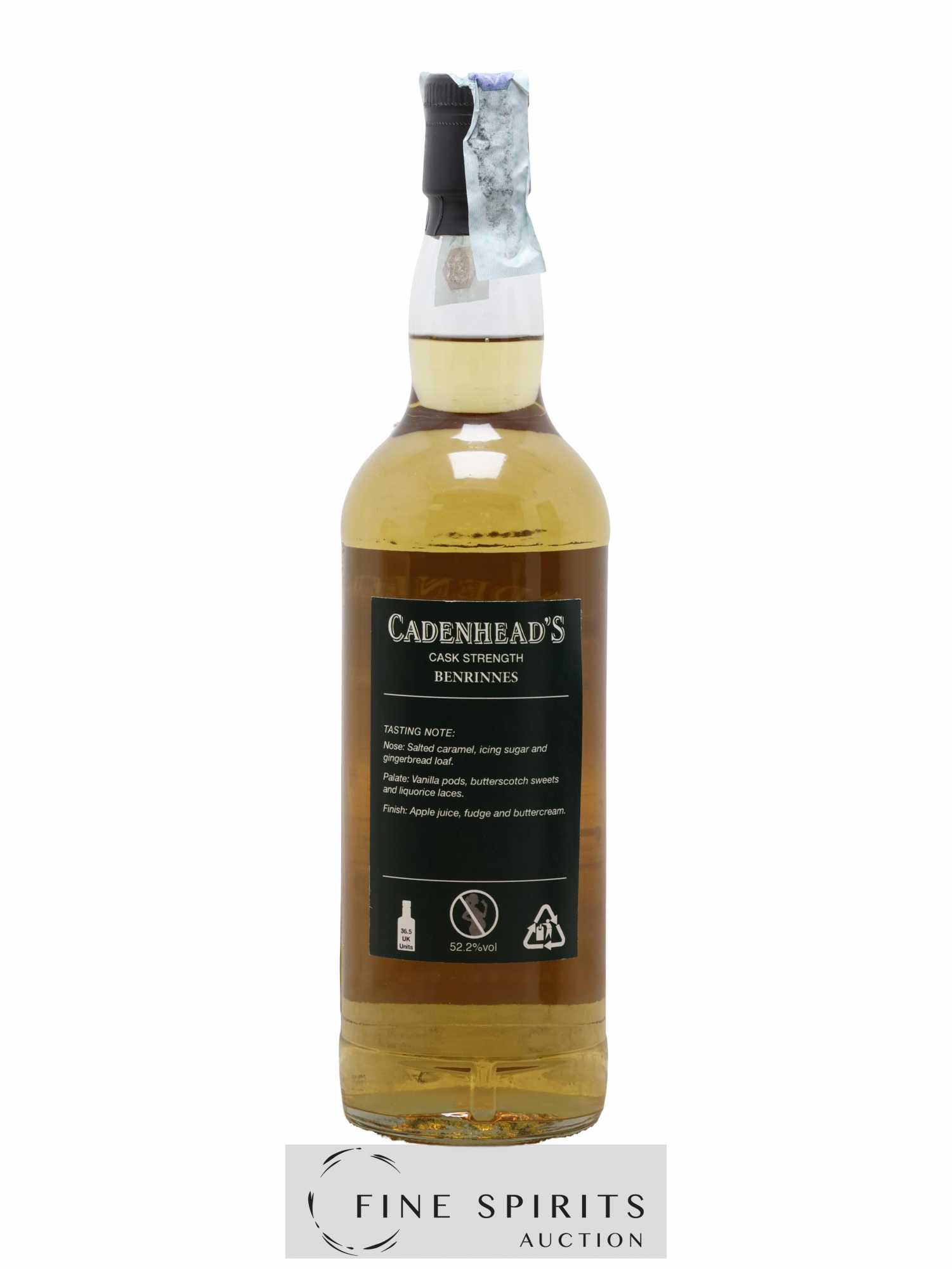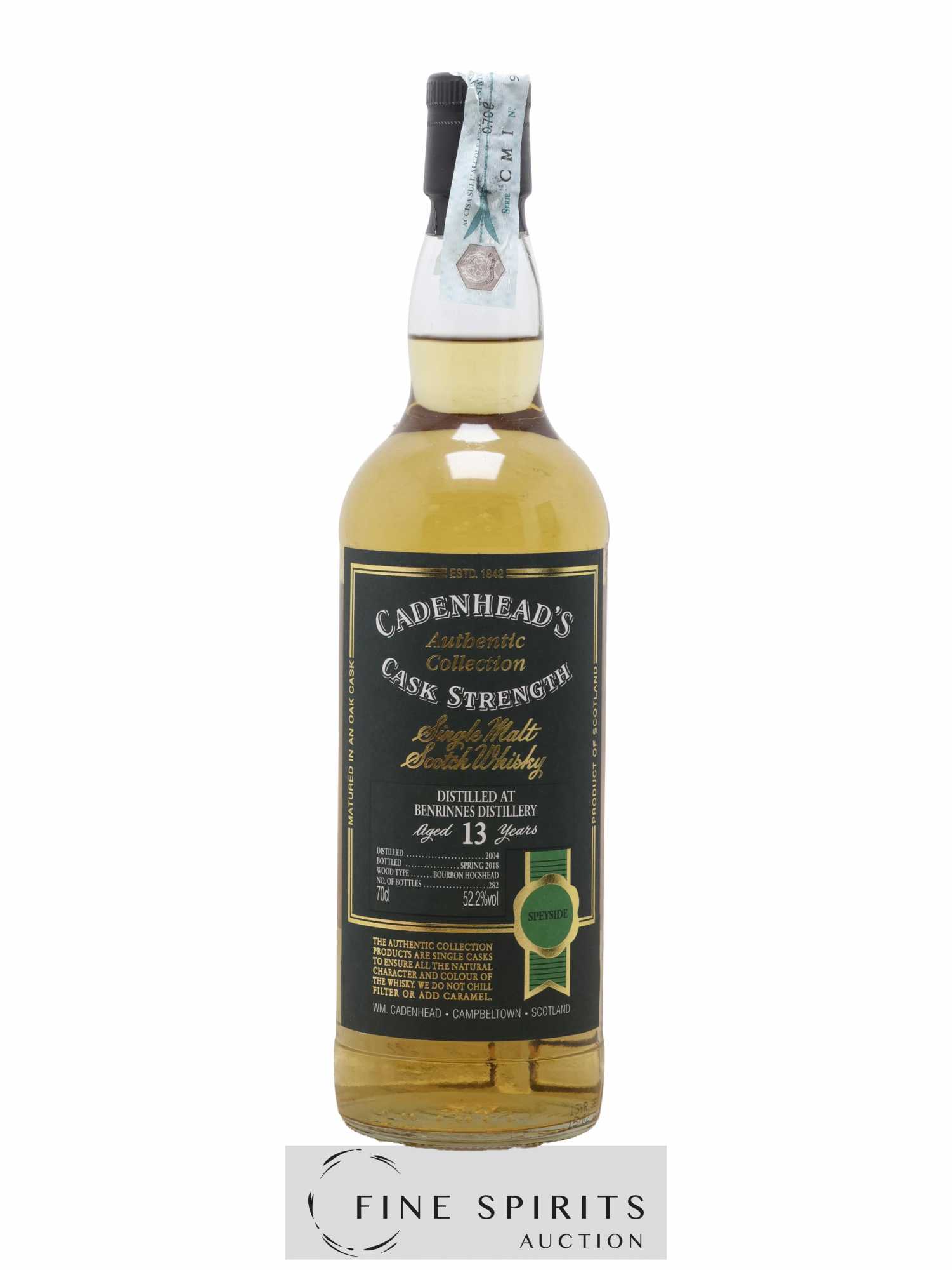 Single cask de Benrinnes distillé en 2004, vieilli en fût de bourbon et embouteillé en 2018 dans la gamme Authentic Collection. Cadenhead's est fondée en 1842 par Georges Duncan à Aberdeen. William Cadenhead rejoint l’’entreprise puis, à la mort de Georges Duncan, en prend les rênes et la rebaptise à son nom, William Cadenhead Ltd. Le neveu de William, Robert Duthie, développe l’’entreprise au début de 20ème siècle et cette dernière reste une entreprise familiale jusqu’’en 1969. William Cadenhead Ltd est ensuite vendue à J. & A. Mitchell and Co., propriétaire de la distillerie Springbank. Hedley G. Wright , descendant direct d’’Archibald et John Mitchell, devient ainsi président de William Cadenhead Ltd. Par le passé, Cadenhead vendait plutôt ses propres marques comme Putachieside, The Hielanman, Seven Stars ou les rhums « Green Label ». Avec Hedley G. Wright à sa tête, Cadenhead commence à s’’intéresser de plus en plus aux single malts. Ainsi, c’’est en 1977 qu’’est créée la mythique collection des « dumpy bottles ». Cette série de single malts avait la particularité d’’être embouteillée avec une légère filtration, sans colorant artificiel et un degré d’’embouteillage assez élevé pour l’’époque (80 proof, 45,7%). L’’étiquette affichait de multiples détails tel que le mois et l’’année de distillation et d’’embouteillage ainsi que l’’utilisation ou non de fût de sherry. Toujours en 1977, l’’entreprise s’’installe à une autre adresse à Aberdeen puis déménage finalement à Campbeltown. Cadenhead vend également des fûts à des embouteilleurs mythiques comme Samaroli ou Corti Brothers dans les années 1980 via une filiale, Duthie’’s. Enfin, deux nouvelles gammes furent créées en 1991 et 1992, « Original Collection » à 46% et « Authentic Collection » au degré naturel. D’’autres séries spéciales pour fêter les anniversaires emblématiques de Cadenhead (150 ans et 175 ans) ainsi que de nouvelles gammes (Small Batch, World Whiskies…) verront le jour jusqu’’à aujourd’’hui. Édition limitée à 282 bouteilles.