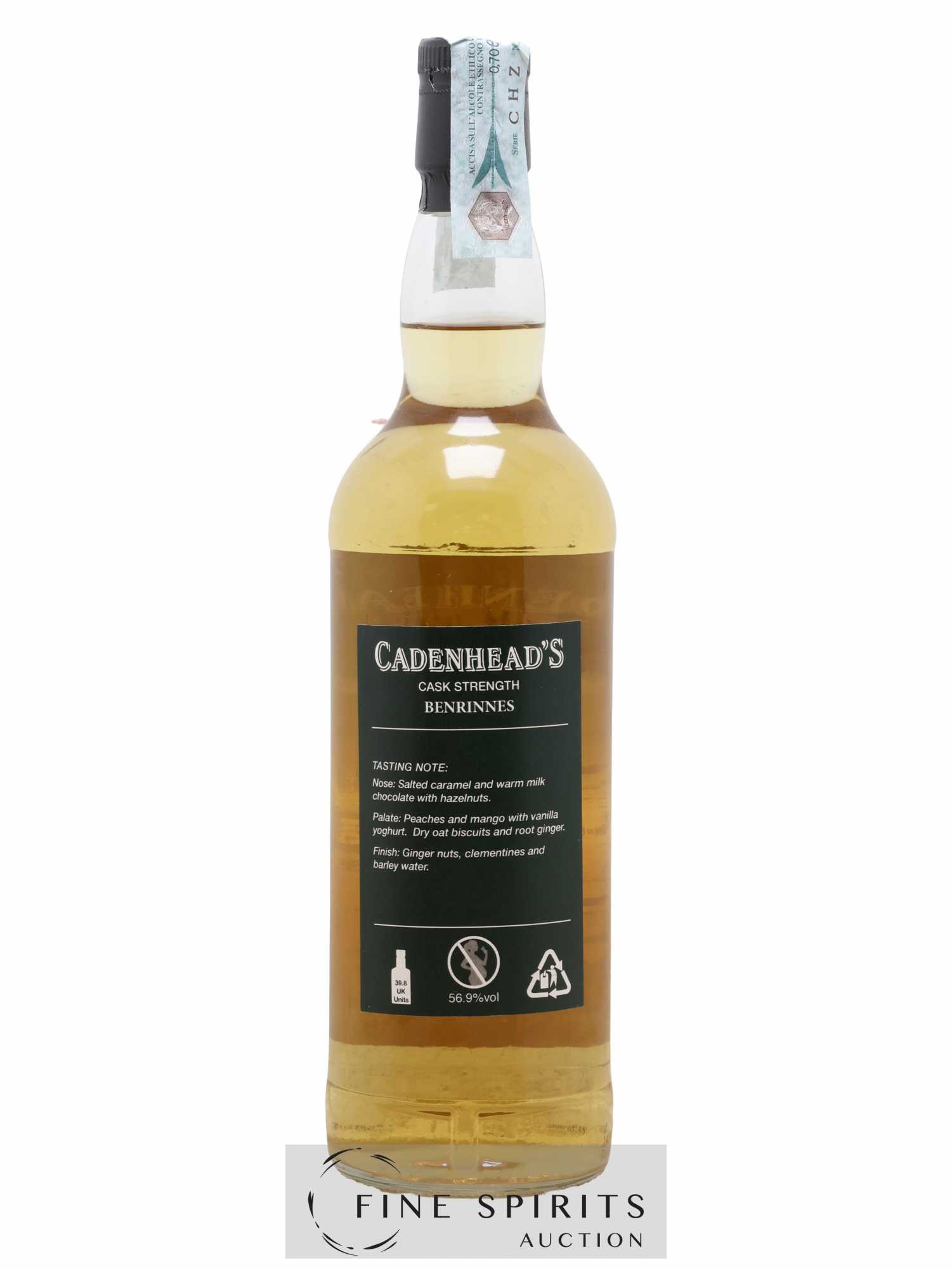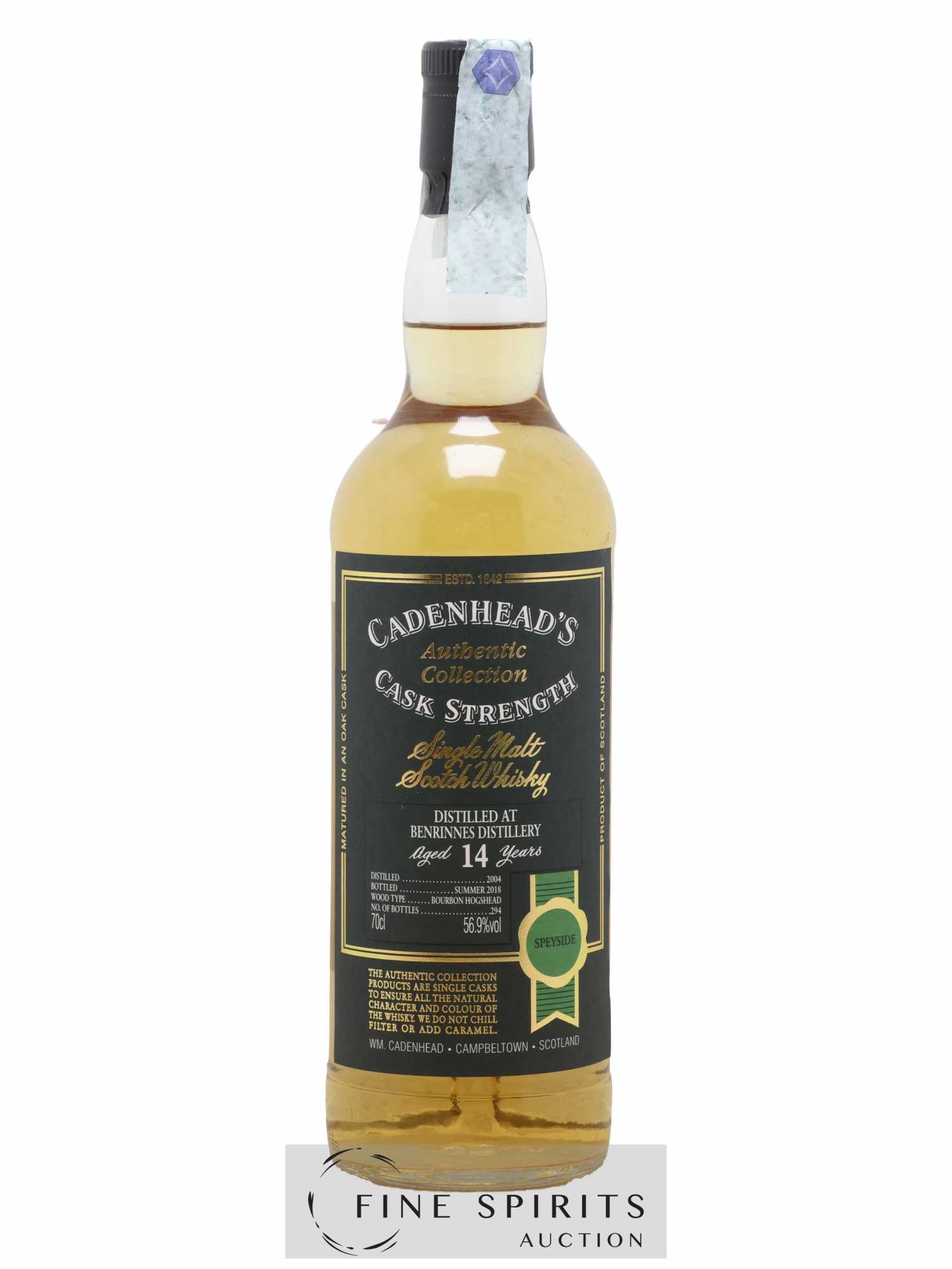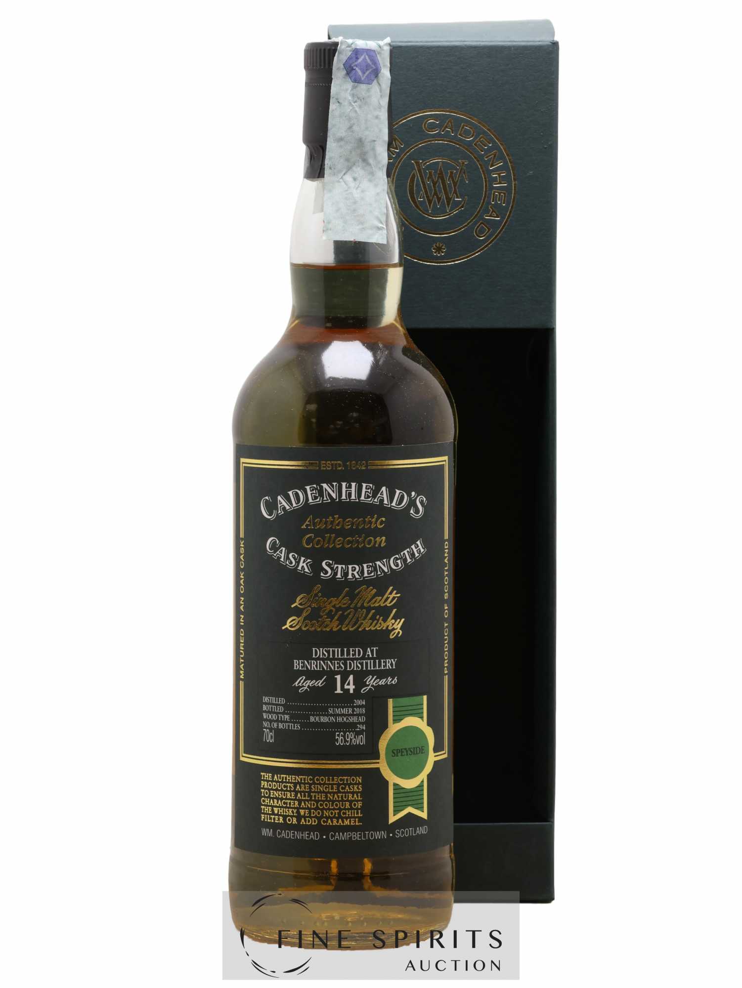 Single cask de Benrinnes distillé en 2004, vieilli en fût de bourbon et embouteillé en 2018 dans la gamme Authentic Collection. Cadenhead's est fondée en 1842 par Georges Duncan à Aberdeen. William Cadenhead rejoint l’entreprise puis, à la mort de Georges Duncan, en prend les rênes et la rebaptise à son nom, William Cadenhead Ltd. Le neveu de William, Robert Duthie, développe l’entreprise au début de 20ème siècle et cette dernière reste une entreprise familiale jusqu’en 1969. William Cadenhead Ltd est ensuite vendue à J. & A. Mitchell and Co., propriétaire de la distillerie Springbank. Hedley G. Wright , descendant direct d’Archibald et John Mitchell, devient ainsi président de William Cadenhead Ltd. Par le passé, Cadenhead vendait plutôt ses propres marques comme Putachieside, The Hielanman, Seven Stars ou les rhums « Green Label ». Avec Hedley G. Wright à sa tête, Cadenhead commence à s’intéresser de plus en plus aux single malts. Ainsi, c’est en 1977 qu’est créée la mythique collection des « dumpy bottles ». Cette série de single malts avait la particularité d’être embouteillée avec une légère filtration, sans colorant artificiel et un degré d’embouteillage assez élevé pour l’époque (80 proof, 45,7%). L’étiquette affichait de multiples détails tel que le mois et l’année de distillation et d’embouteillage ainsi que l’utilisation ou non de fût de sherry. Toujours en 1977, l’entreprise s’installe à une autre adresse à Aberdeen puis déménage finalement à Campbeltown. Cadenhead vend également des fûts à des embouteilleurs mythiques comme Samaroli ou Corti Brothers dans les années 1980 via une filiale, Duthie’s. Enfin, deux nouvelles gammes furent créées en 1991 et 1992, « Original Collection » à 46% et « Authentic Collection » au degré naturel. D’autres séries spéciales pour fêter les anniversaires emblématiques de Cadenhead (150 ans et 175 ans) ainsi que de nouvelles gammes (Small Batch, World Whiskies…) verront le jour jusqu’à aujourd’hui. Édition limitée à 294 bouteilles.