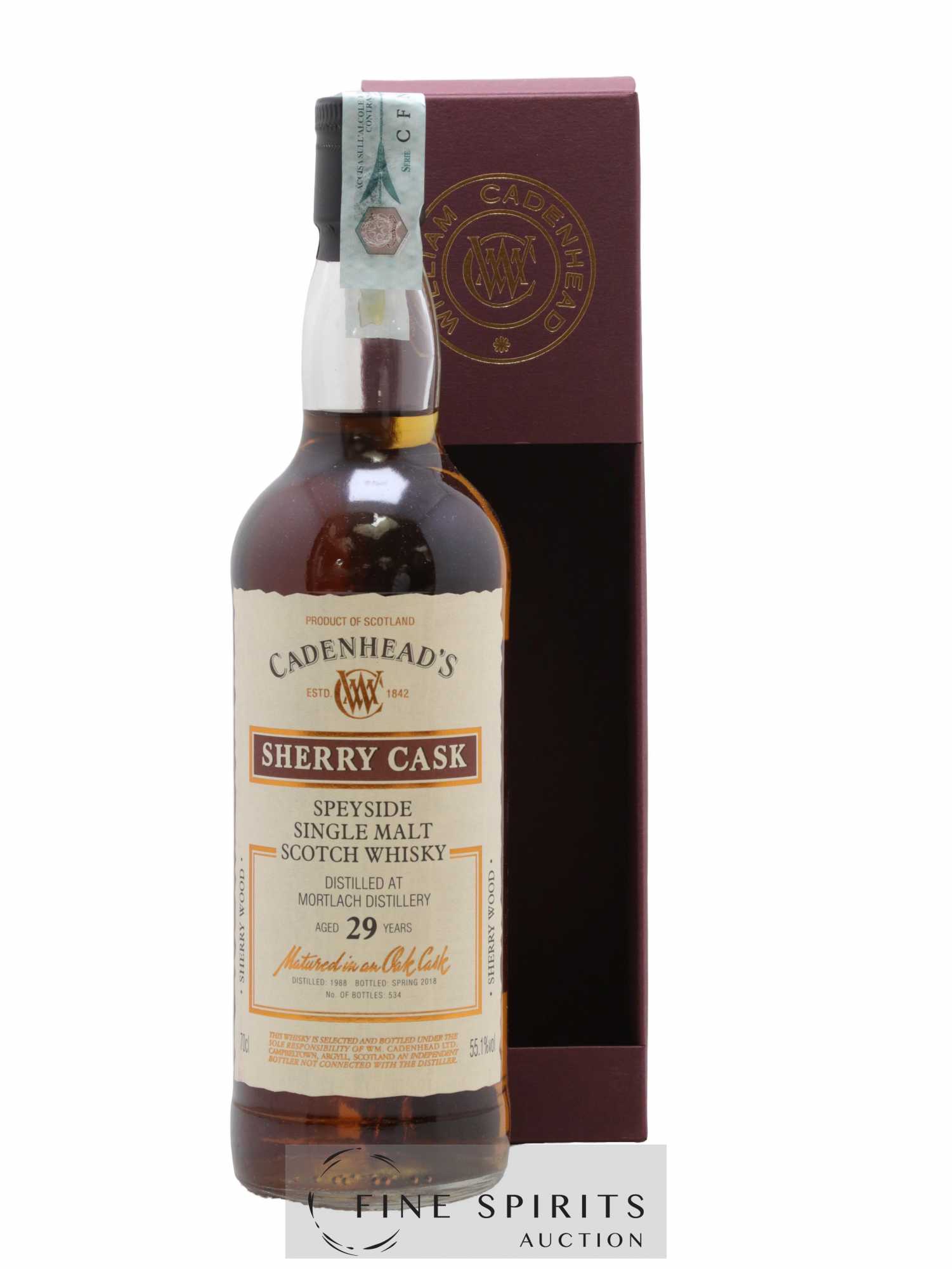 Single cask de Mortlach distillé en 1988, vieilli en fût de sherry et embouteillé en 2018. Cadenhead's est fondée en 1842 par Georges Duncan à Aberdeen. William Cadenhead rejoint l’’entreprise puis, à la mort de Georges Duncan, en prend les rênes et la rebaptise à son nom, William Cadenhead Ltd. Le neveu de William, Robert Duthie, développe l’’entreprise au début de 20ème siècle et cette dernière reste une entreprise familiale jusqu’’en 1969. William Cadenhead Ltd est ensuite vendue à J. & A. Mitchell and Co., propriétaire de la distillerie Springbank. Hedley G. Wright , descendant direct d’’Archibald et John Mitchell, devient ainsi président de William Cadenhead Ltd. Par le passé, Cadenhead vendait plutôt ses propres marques comme Putachieside, The Hielanman, Seven Stars ou les rhums « Green Label ». Avec Hedley G. Wright à sa tête, Cadenhead commence à s’’intéresser de plus en plus aux single malts. Ainsi, c’’est en 1977 qu’’est créée la mythique collection des « dumpy bottles ». Cette série de single malts avait la particularité d’’être embouteillée avec une légère filtration, sans colorant artificiel et un degré d’’embouteillage assez élevé pour l’’époque (80 proof, 45,7%). L’’étiquette affichait de multiples détails tel que le mois et l’’année de distillation et d’’embouteillage ainsi que l’’utilisation ou non de fût de sherry. Toujours en 1977, l’’entreprise s’’installe à une autre adresse à Aberdeen puis déménage finalement à Campbeltown. Cadenhead vend également des fûts à des embouteilleurs mythiques comme Samaroli ou Corti Brothers dans les années 1980 via une filiale, Duthie’’s. Enfin, deux nouvelles gammes furent créées en 1991 et 1992, « Original Collection » à 46% et « Authentic Collection » au degré naturel. D’’autres séries spéciales pour fêter les anniversaires emblématiques de Cadenhead (150 ans et 175 ans) ainsi que de nouvelles gammes (Small Batch, World Whiskies…) verront le jour jusqu’’à aujourd’’hui. Édition limitée à 534 bouteilles.