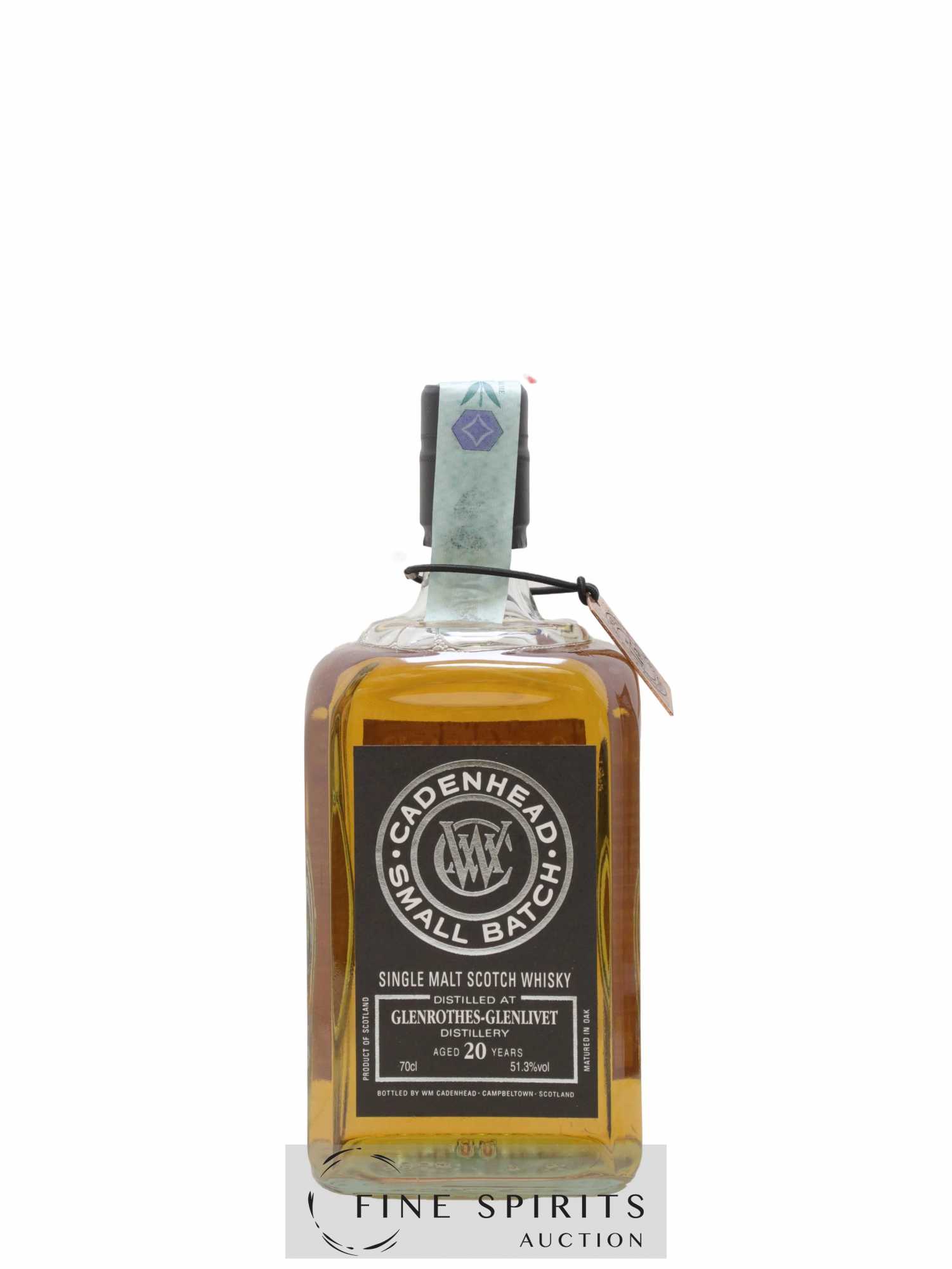 Small batch de Glenrothes distillé en 1996, vieilli en fût de bourbon et embouteillé en 2017. Cadenhead's est fondée en 1842 par Georges Duncan à Aberdeen. William Cadenhead rejoint l’entreprise puis, à la mort de Georges Duncan, en prend les rênes et la rebaptise à son nom, William Cadenhead Ltd. Le neveu de William, Robert Duthie, développe l’entreprise au début de 20ème siècle et cette dernière reste une entreprise familiale jusqu’en 1969. William Cadenhead Ltd est ensuite vendue à J. & A. Mitchell and Co., propriétaire de la distillerie Springbank. Hedley G. Wright , descendant direct d’Archibald et John Mitchell, devient ainsi président de William Cadenhead Ltd. Par le passé, Cadenhead vendait plutôt ses propres marques comme Putachieside, The Hielanman, Seven Stars ou les rhums « Green Label ». Avec Hedley G. Wright à sa tête, Cadenhead commence à s’intéresser de plus en plus aux single malts. Ainsi, c’est en 1977 qu’est créée la mythique collection des « dumpy bottles ». Cette série de single malts avait la particularité d’être embouteillée avec une légère filtration, sans colorant artificiel et un degré d’embouteillage assez élevé pour l’époque (80 proof, 45,7%). L’étiquette affichait de multiples détails tel que le mois et l’année de distillation et d’embouteillage ainsi que l’utilisation ou non de fût de sherry. Toujours en 1977, l’entreprise s’installe à une autre adresse à Aberdeen puis déménage finalement à Campbeltown. Cadenhead vend également des fûts à des embouteilleurs mythiques comme Samaroli ou Corti Brothers dans les années 1980 via une filiale, Duthie’s. Enfin, deux nouvelles gammes furent créées en 1991 et 1992, « Original Collection » à 46% et « Authentic Collection » au degré naturel. D’autres séries spéciales pour fêter les anniversaires emblématiques de Cadenhead (150 ans et 175 ans) ainsi que de nouvelles gammes (Small Batch, World Whiskies…) verront le jour jusqu’à aujourd’hui. Édition limitée à 1314 bouteilles.