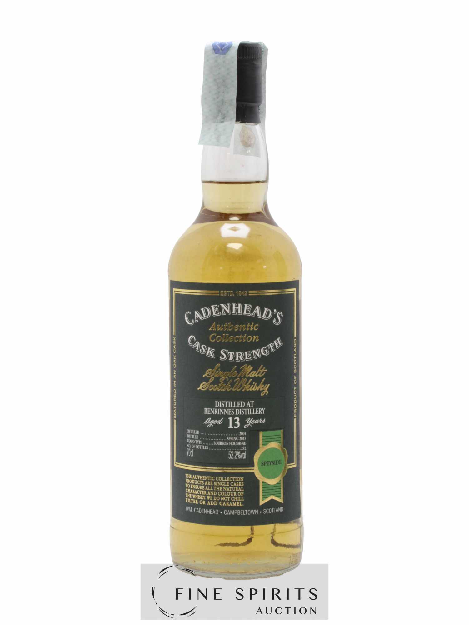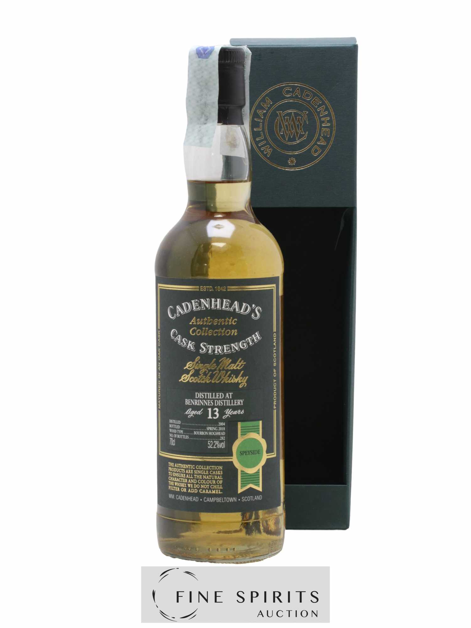 Single cask de Benrinnes distillé en 2004, vieilli en fût de bourbon et embouteillé en 2018 dans la gamme Authentic Collection. Cadenhead's est fondée en 1842 par Georges Duncan à Aberdeen. William Cadenhead rejoint l’’entreprise puis, à la mort de Georges Duncan, en prend les rênes et la rebaptise à son nom, William Cadenhead Ltd. Le neveu de William, Robert Duthie, développe l’’entreprise au début de 20ème siècle et cette dernière reste une entreprise familiale jusqu’’en 1969. William Cadenhead Ltd est ensuite vendue à J. & A. Mitchell and Co., propriétaire de la distillerie Springbank. Hedley G. Wright , descendant direct d’’Archibald et John Mitchell, devient ainsi président de William Cadenhead Ltd. Par le passé, Cadenhead vendait plutôt ses propres marques comme Putachieside, The Hielanman, Seven Stars ou les rhums « Green Label ». Avec Hedley G. Wright à sa tête, Cadenhead commence à s’’intéresser de plus en plus aux single malts. Ainsi, c’’est en 1977 qu’’est créée la mythique collection des « dumpy bottles ». Cette série de single malts avait la particularité d’’être embouteillée avec une légère filtration, sans colorant artificiel et un degré d’’embouteillage assez élevé pour l’’époque (80 proof, 45,7%). L’’étiquette affichait de multiples détails tel que le mois et l’’année de distillation et d’’embouteillage ainsi que l’’utilisation ou non de fût de sherry. Toujours en 1977, l’’entreprise s’’installe à une autre adresse à Aberdeen puis déménage finalement à Campbeltown. Cadenhead vend également des fûts à des embouteilleurs mythiques comme Samaroli ou Corti Brothers dans les années 1980 via une filiale, Duthie’’s. Enfin, deux nouvelles gammes furent créées en 1991 et 1992, « Original Collection » à 46% et « Authentic Collection » au degré naturel. D’’autres séries spéciales pour fêter les anniversaires emblématiques de Cadenhead (150 ans et 175 ans) ainsi que de nouvelles gammes (Small Batch, World Whiskies…) verront le jour jusqu’’à aujourd’’hui. Édition limitée à 282 bouteilles.