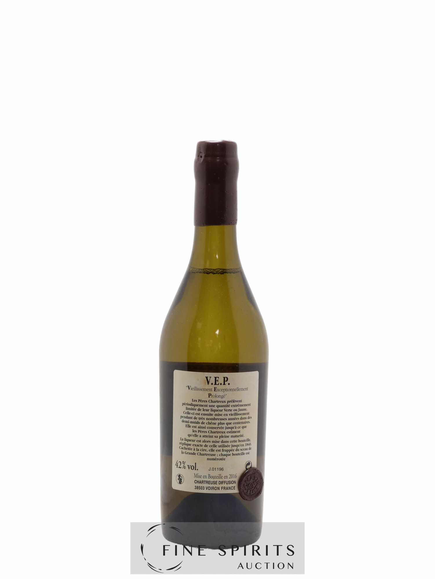 Créées en 1963, les V.E.P. sont élaborées comme des Chartreuses Jaunes et Vertes classiques mais bénéficient d’un long élevage en demi-muids - plus petits que les foudres sans lesquels sont élevées les autres - de chêne qui leur confère une compléxité supplémentaire. La bouteille des V.E.P. reprend celle de la première bouteille de Chartreuse connue, datant de 1840. La verte titre à 54% et la jaune à 42%. Les indications de millésime ou d’année d'embouteillages ont varié au fil des années ; aujourd’hui, c’est l’année de mise en bouteille qui est indiquée. Il s'agit en l'occurrence de la mise 2016.