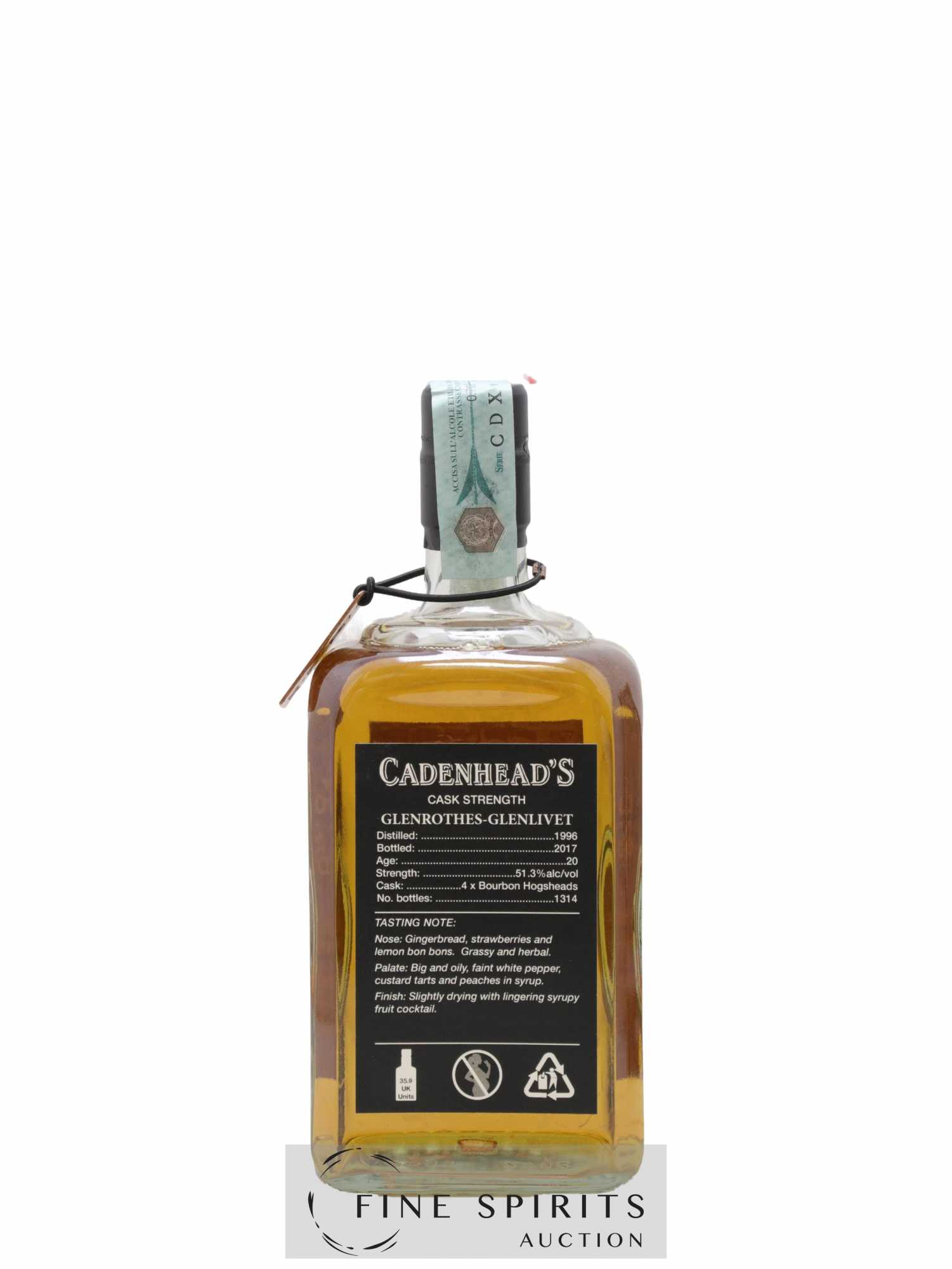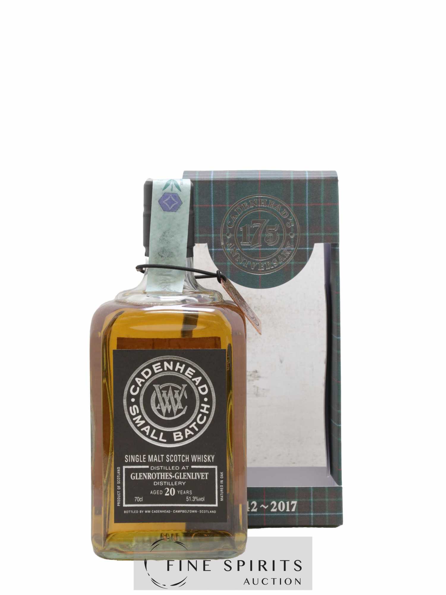 Small batch de Glenrothes distillé en 1996, vieilli en fût de bourbon et embouteillé en 2017. Cadenhead's est fondée en 1842 par Georges Duncan à Aberdeen. William Cadenhead rejoint l’entreprise puis, à la mort de Georges Duncan, en prend les rênes et la rebaptise à son nom, William Cadenhead Ltd. Le neveu de William, Robert Duthie, développe l’entreprise au début de 20ème siècle et cette dernière reste une entreprise familiale jusqu’en 1969. William Cadenhead Ltd est ensuite vendue à J. & A. Mitchell and Co., propriétaire de la distillerie Springbank. Hedley G. Wright , descendant direct d’Archibald et John Mitchell, devient ainsi président de William Cadenhead Ltd. Par le passé, Cadenhead vendait plutôt ses propres marques comme Putachieside, The Hielanman, Seven Stars ou les rhums « Green Label ». Avec Hedley G. Wright à sa tête, Cadenhead commence à s’intéresser de plus en plus aux single malts. Ainsi, c’est en 1977 qu’est créée la mythique collection des « dumpy bottles ». Cette série de single malts avait la particularité d’être embouteillée avec une légère filtration, sans colorant artificiel et un degré d’embouteillage assez élevé pour l’époque (80 proof, 45,7%). L’étiquette affichait de multiples détails tel que le mois et l’année de distillation et d’embouteillage ainsi que l’utilisation ou non de fût de sherry. Toujours en 1977, l’entreprise s’installe à une autre adresse à Aberdeen puis déménage finalement à Campbeltown. Cadenhead vend également des fûts à des embouteilleurs mythiques comme Samaroli ou Corti Brothers dans les années 1980 via une filiale, Duthie’s. Enfin, deux nouvelles gammes furent créées en 1991 et 1992, « Original Collection » à 46% et « Authentic Collection » au degré naturel. D’autres séries spéciales pour fêter les anniversaires emblématiques de Cadenhead (150 ans et 175 ans) ainsi que de nouvelles gammes (Small Batch, World Whiskies…) verront le jour jusqu’à aujourd’hui. Édition limitée à 1314 bouteilles.