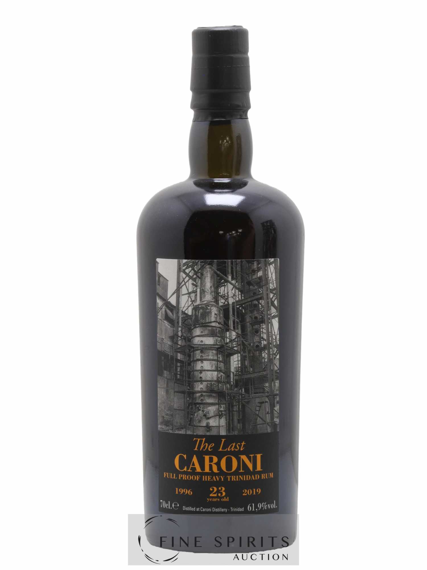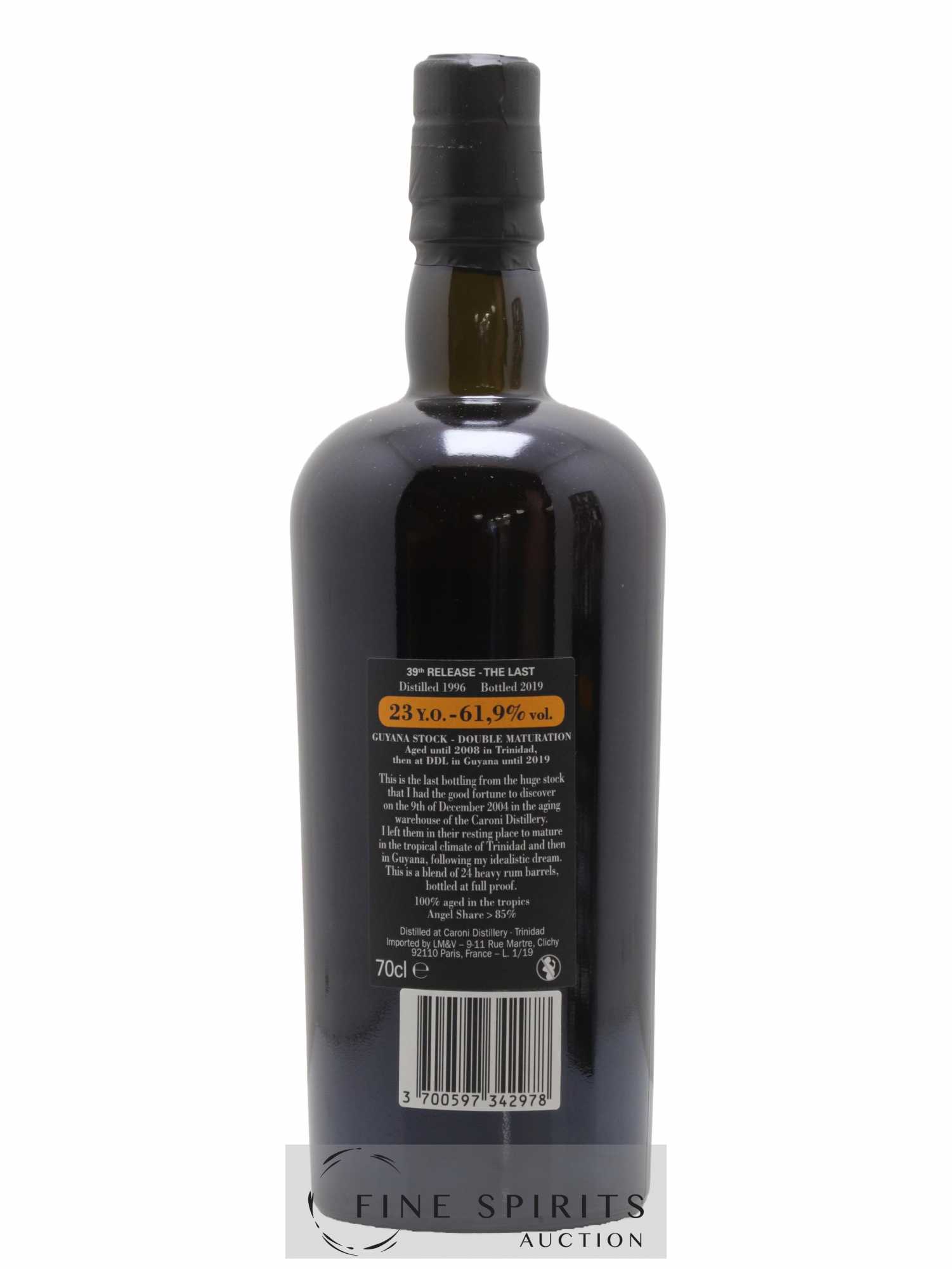 Caroni distillé en 1996 et embouteillé par Velier en 2019 après 23 ans d'élevage en fût, d'abord à Trinidad puis au Guyana, dans les chais de Demerara Distillers Limited, à partir de 2008. Assemblage de 24 fûts de heavy rums, il s'agit du dernier embouteillage (le 38ème) de Caroni par Velier dans sa célèbre série même si des embouteillages Employees ont suivi. Velier est fondé par Casimir Chaix à Gênes en 1947. C'est une petite entreprise familiale dont l'activité est l'importation et la distribution de vin et de spiritueux. Luca Gargano, ancien représentant de Saint James et grand amateur et collectionneur de rhum, la rachète en 1986 et lance son activité de négoce, d'abord avec le whisky en 1992 puis avec le rhum en 1996. C'est cette année 1996 que Gargano embouteille ses premiers Demerara. En 2004, Gargano est invité par Demerara Distillers Limited (DDL) au Guyana par son ami Yesu Persaud, alors président de DDL, pour y choisir des fûts. Ce partenariat cesse en 2015 avec le départ à la retraite de monsieur Persaud mais les rhums embouteillés dans l'intervalle entrent dans la légende. Il en va de même avec les fûts de Caroni qu'il rachète en 2005, deux ans après la fermeture de la distillerie, suite à une visite à Trinidad avec Fredi Marcarini l'année passée pour y prendre des photographies. Ces deux lignées d'embouteillages ont fait la réputation de Velier qui est aujourd'hui également connu pour son travail dans d'autres territoires des Caraïbes comme la Barbade, la Jamaïque, Haïti ou Marie-Galante. Les rhums sélectionnés par Velier ont la particularité de n'avoir été élevés que sous climat tropical d'où une concentration aromatique et une part des anges considérables. Il les embouteille généralement brut de fût ou avec de légères réductions. Enfin, Luca Gargano milite depuis plusieurs années pour une classification plus rigoureuse du rhum dont il a proposé son propre modèle, adopté depuis par plusieurs partenaires de Velier.