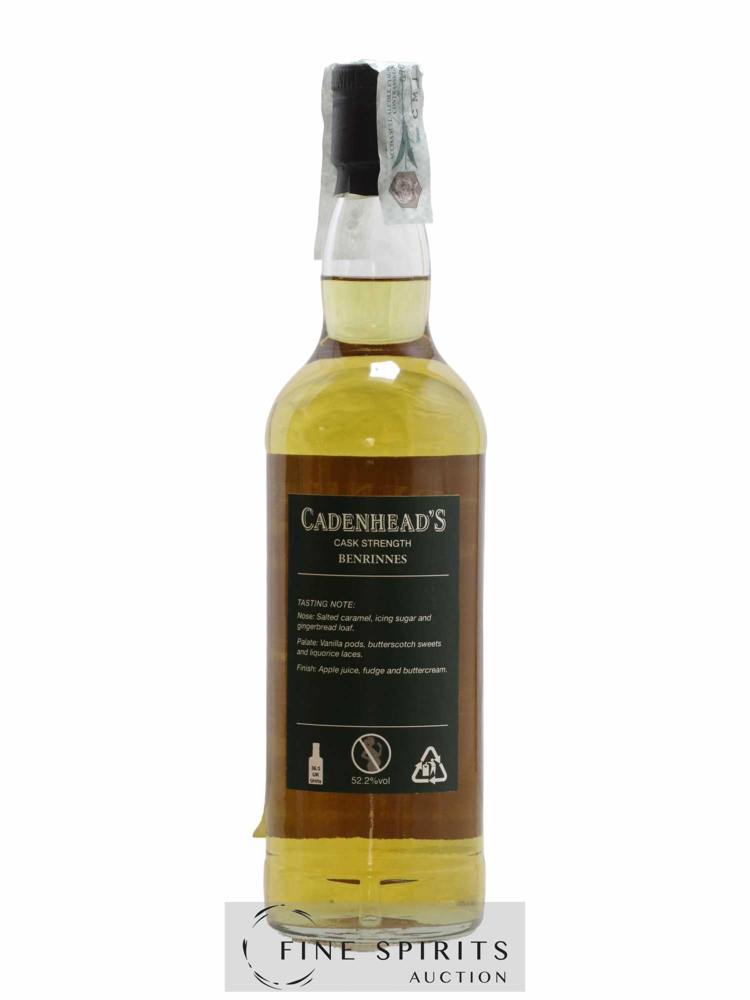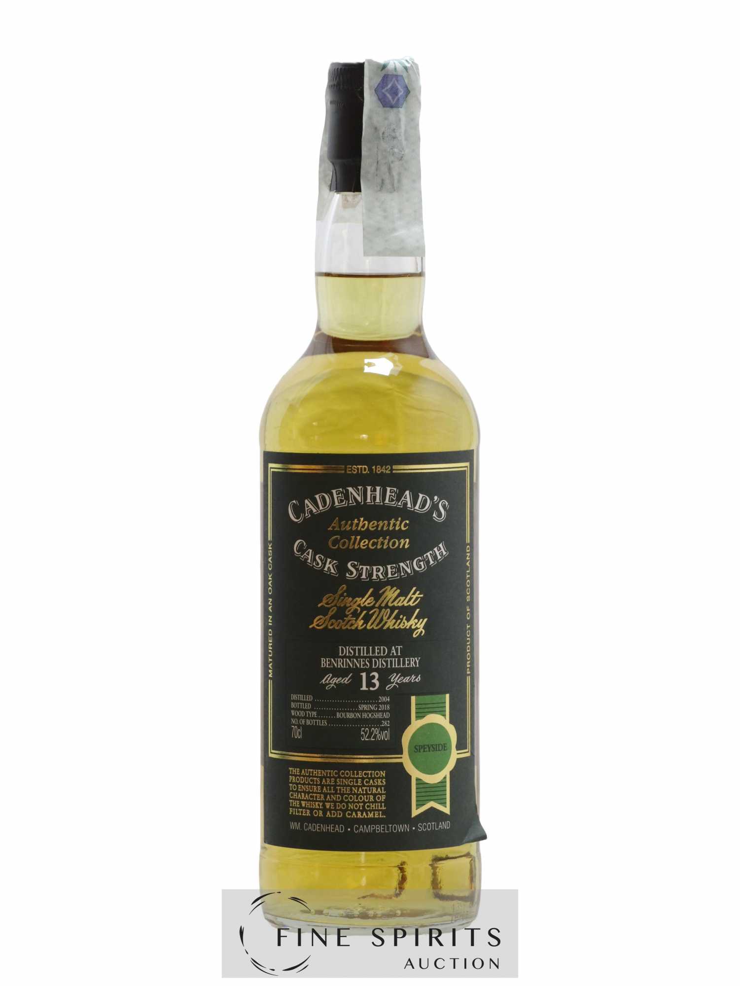 A Benrinnes single cask distilled in 2004, matured in a bourbon cask and bottled in 2018 for the Authentic Collection. Cadenhead's was founded in Aberdeen in 1842 by George Duncan. William Cadenhead then joined the company and, when George Duncan died in 1858, took over and renamed the business after himself. William’’s nephew Roberth Duthie developed the company in the early 20th century and it remained a family business until 1969. William Cadenhead Ltd was then sold to the Springbank distillery’’s owner J. & A. Mitchell and Co. Hedley G. Wright, a direct descendent of Archibald and John Mitchell, became William Cadenhead Ltd’’s CEO. In the past, Cadenhead had mainly sold its own brands, such as Putachieside, The Hielanman, Seven Stars and Green Label rums. Under Hedley G. Wright, the company began to take more of an interest in single malts. This led to the creation of the legendary collection of dumpy bottles in 1977. This series of single malts stood out for its very gentle filtration, lack of artificial colouring, and relatively high bottling strength for the time (80 proof/45.7% ABV). The labels included lots of information, including the month and year of distillation and bottling, and whether or not sherry casks were used. Also in 1977, the business moved to another address in Aberdeen, and finally to Campbeltown. In the 1980s, Cadenhead sold casks to legendary bottlers such as Samaroli and Corti Brothers through the subsidiary Duthie’’s. Finally, two new whisky ranges were created in 1991 and 1992, the Original Collection bottled at 46% and the Authentic Collection bottled at cask strength. Other special series to mark Cadenhead’’s major anniversaries (150 and 175 years), as well as new ranges launched since (Small Batch, World Whiskies, etc.), have all contributed to the company’’s ongoing history up to the present day. A limited edition of 282 bottles.
