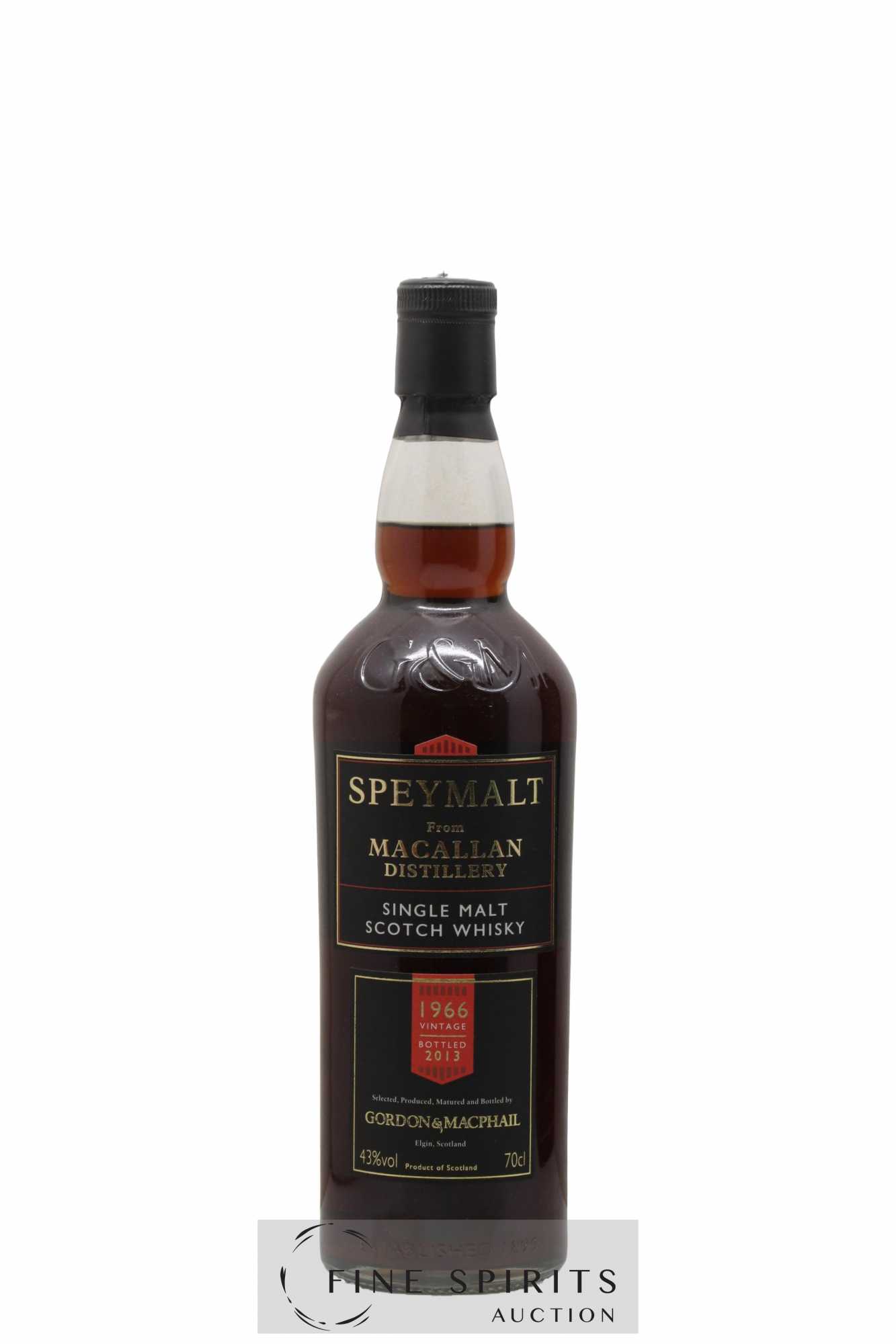 A single malt Macallan distilled in 1966, aged in sherry casks and bottled in 2013 by independent bottler Gordon & MacPhail. Gordon & MacPhail was founded in Elgin in 1895 by James Gordon and John Alexander MacPhail. As was often the case at the time, the business started out as a delicatessen and wine merchant. In 1915, John Alexander MacPhail retired and a new partner joined the business, John Urquhart. He was joined by his son George in 1933, a few years after James Gordon died in a car crash. Gordon & MacPhail works with many of Speyside’s leading distilleries, from whom it has accumulated considerable stocks. It is also licensed to bottle whiskies for many of them, including Glen Grant, Linkwood, Mortlach, Macallan and Glenlivet. The business really took off in the 1970s, acquiring distributors in a huge range of countries and selling casks to several Italian bottlers in selections that would become legends in their own right. Gordon & MacPhail is still run by the Urquhart family today, from the same building, and is one of the most iconic bottlers in the industry, with incredible stocks of sometimes very old and rare whiskies. The company is in complete control of the entire maturation process. Gordon & MacPhail has also owned the Benromach distillery since 1993.